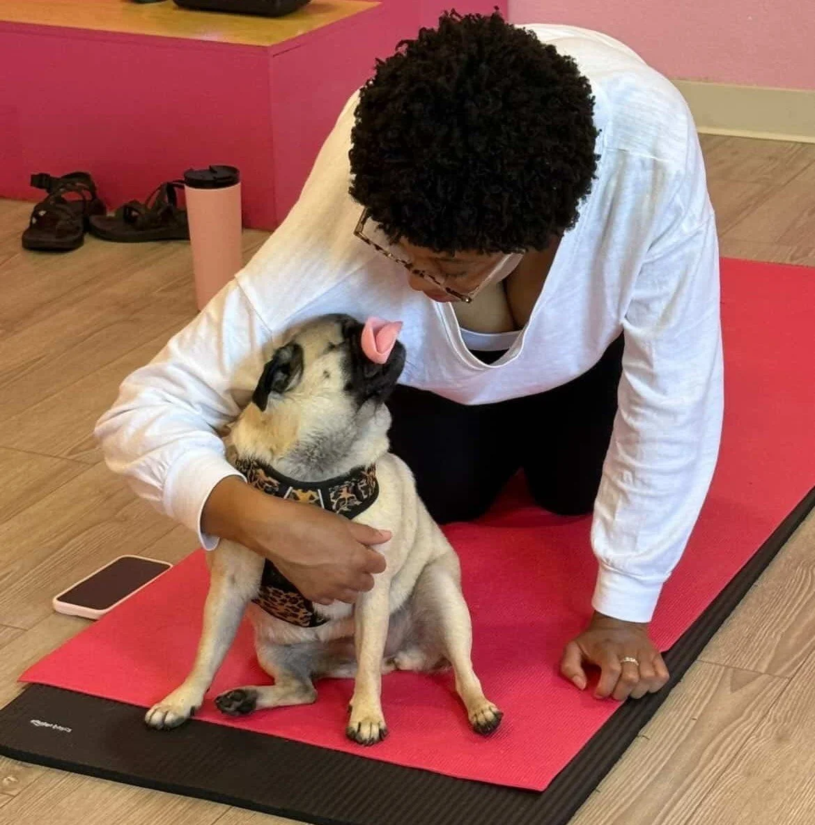 ↪️ Following the introduction, we will begin the yoga portion of our event. Following the yoga flow, you will have an opportunity to mix and mingle with the other participants and the pugs*!